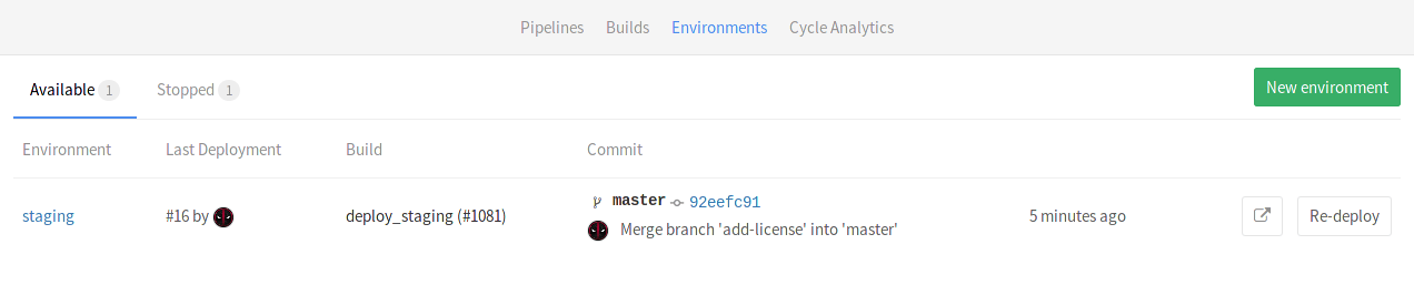 • A button that re-deploys the latest deployment, meaning it runs the job defined by the environment name for that specific commit