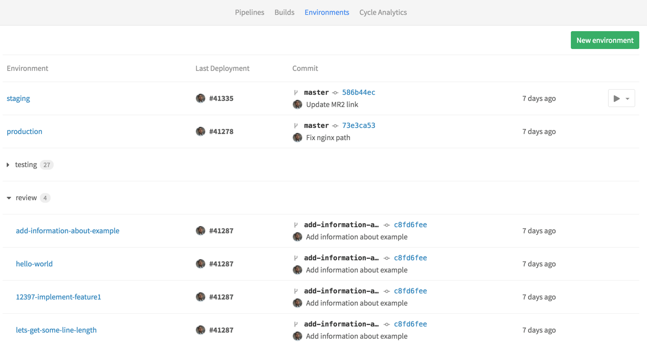 We now have a full development cycle, where our app is tested, built, deployed as a Review app, deployed to a staging server once the merge request is merged, and finally manually deployed to the production server. What we just described is a single workflow, but imagine tens of developers working on a project at the same time. They each push to their branches, and dynamic environments are created all the time. In that case, we probably need to do some clean up. Read next how environments can be stopped.
