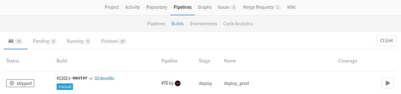 Clicking on the play button in either of these places will trigger the deploy_prod job, and the deployment will be recorded under a new environment named production.