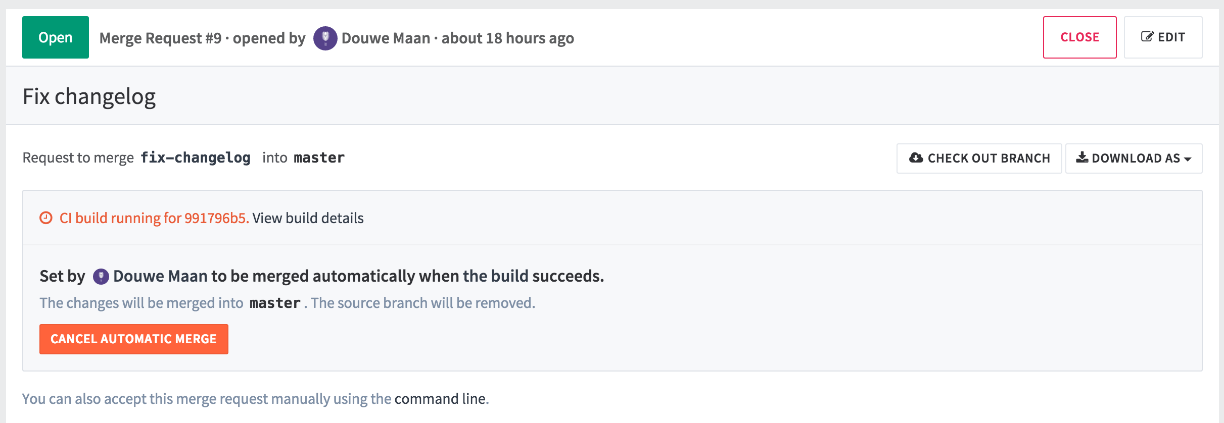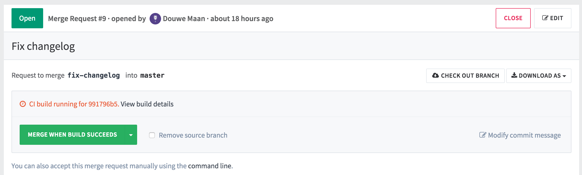 When reviewing a merge request that looks ready to merge but still has one or more CI builds running, you can set it to be merged automatically when the builds pipeline succeeds. This way, you don't have to wait for the builds to finish and remember to merge the request manually.